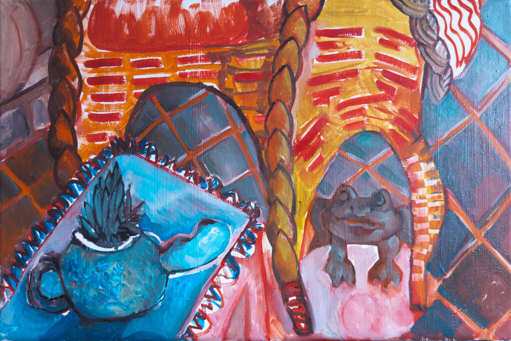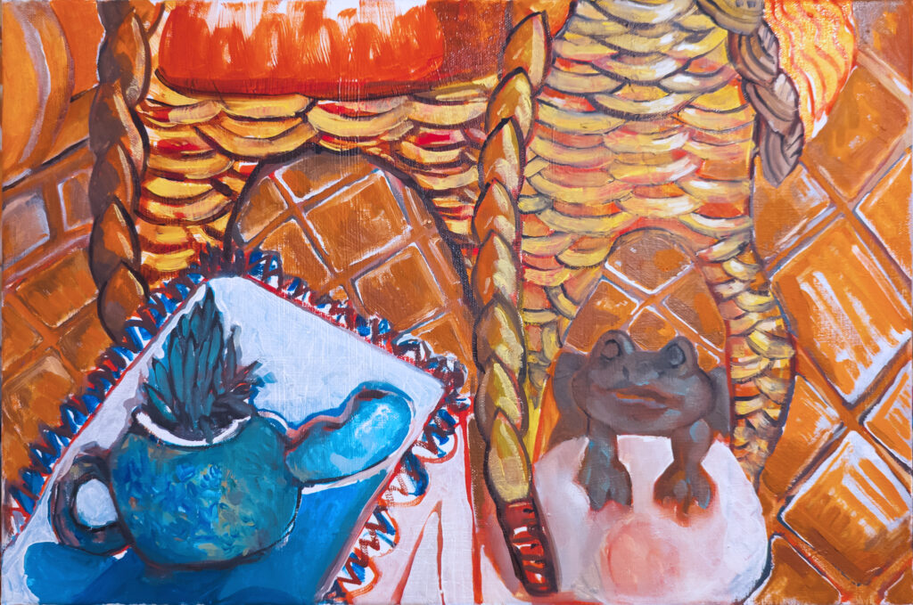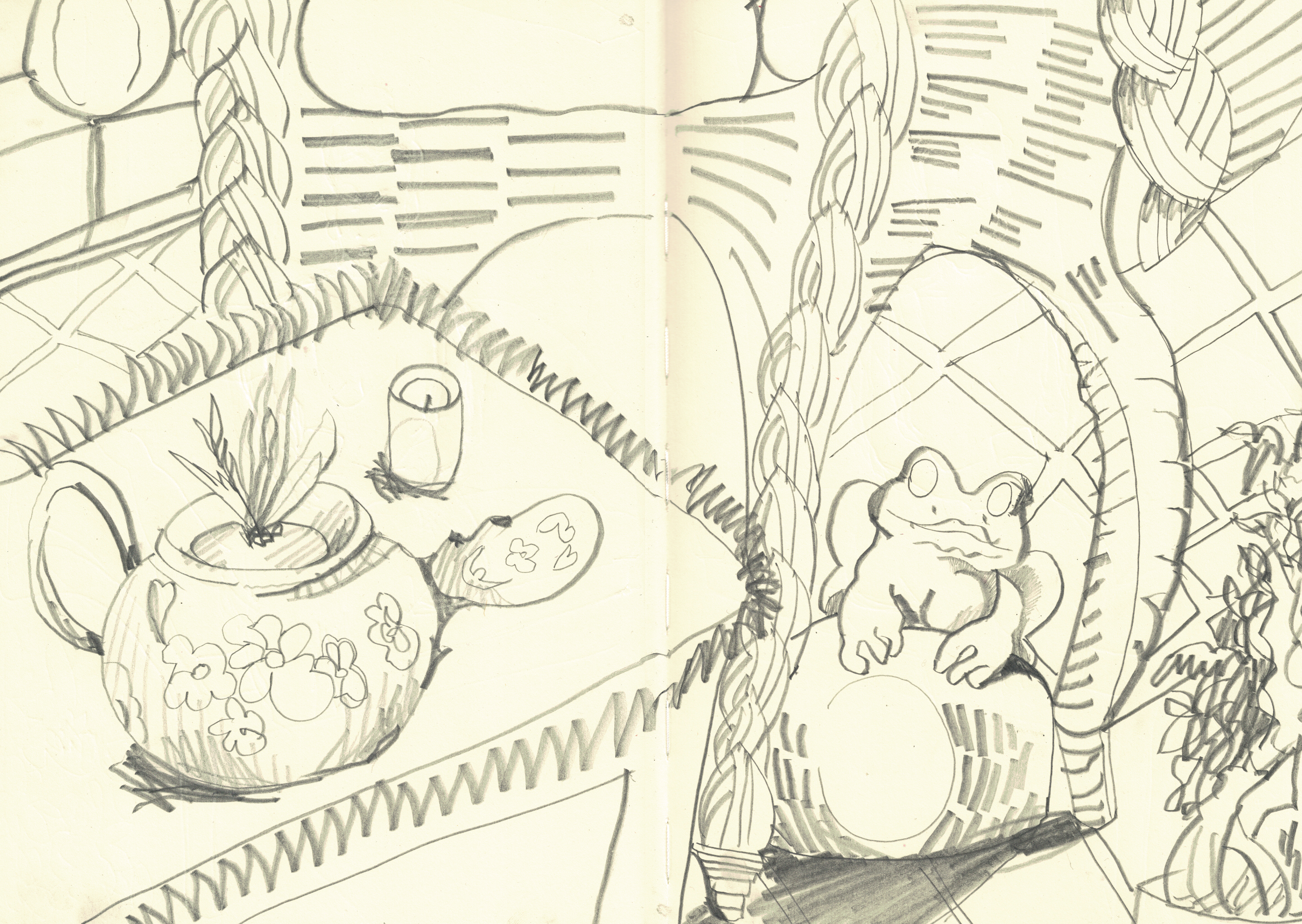 Le soleil de fin de journée inonde la terrasse d’un rouge orangé intense. L’instant est propice à la rêverie. Je remarque une petite statue de grenouille en plâtre. J’organise rapidement une composition avec les différents éléments. Je dessine la scène au crayon de papier dans un carnet de croquis puis referme le carnet, je n’y toucherai plus pendant un ou deux mois.